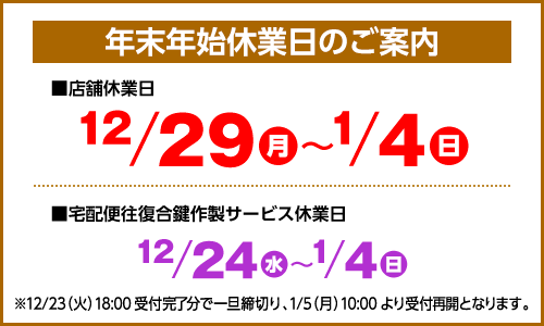 ●返品によるご返金をご希望の場合は、合鍵を作製した日から7日以内にご連絡いただいた上で、当店作製の合鍵とレシートもしくは領収書をお持ちください。店頭にて合鍵作製代金のみをご返金いたします。
