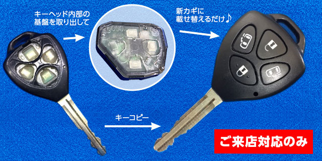 破損した車のリモコンキーの中身(トランスミッター、ICチップ)だけを取り出し、同型のリモコンブランクキー(社外品)に載せ替えて金属の鍵を複製する「キーシェル交換」